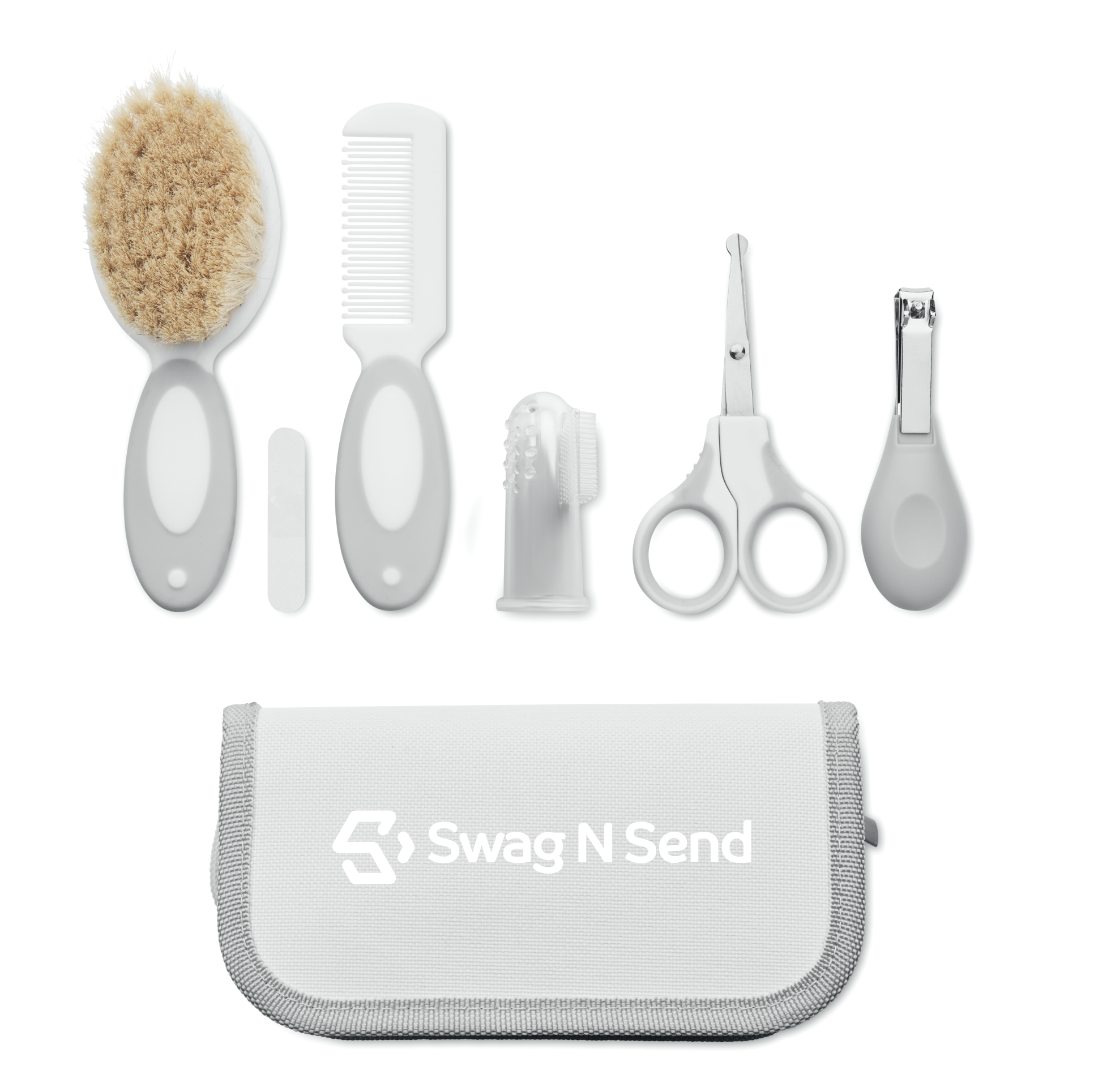 6 piece baby grooming set. Includes: gentle care brush, baby comb, tooth brush, nail file, nail clippers and scissors. Presented in 600D polyester bag, perfect for baby packs