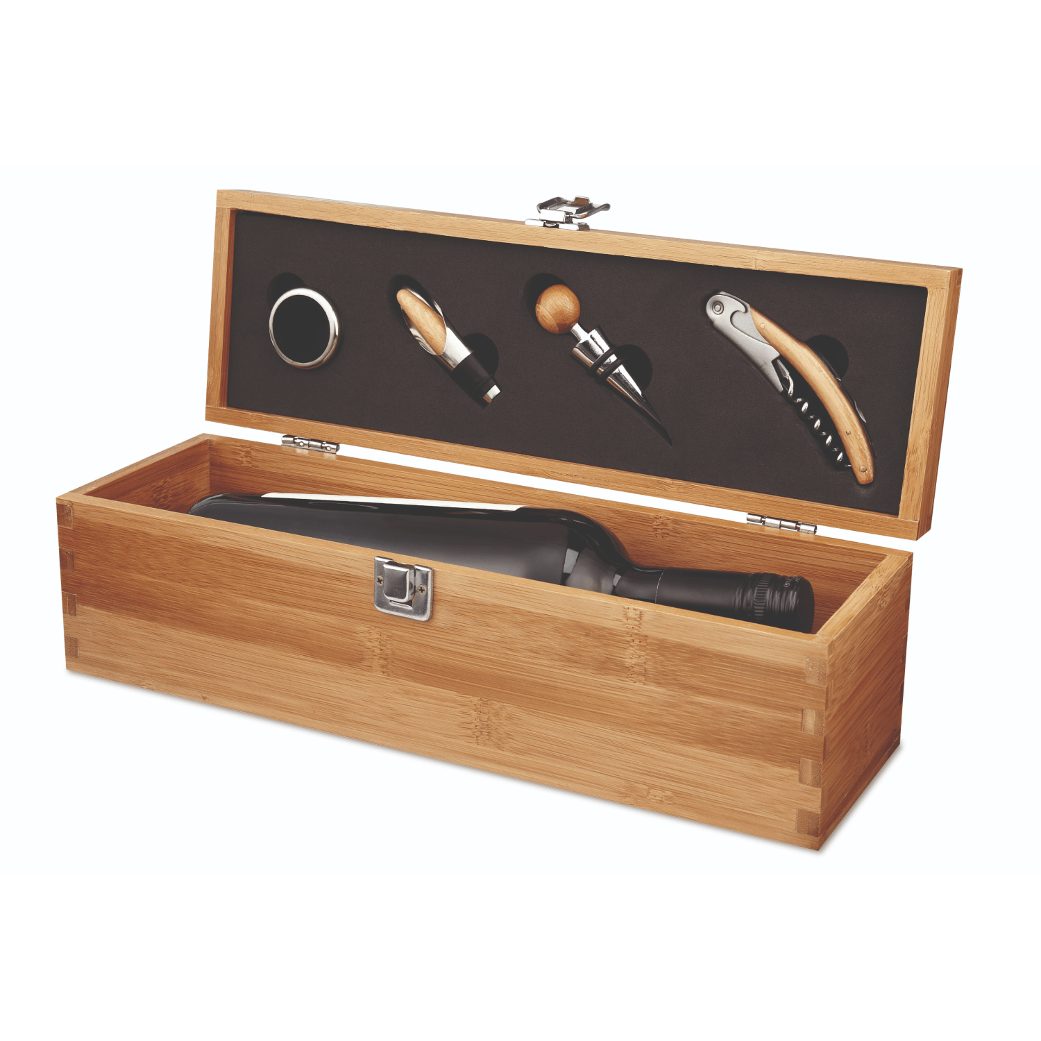 Wine accessory set presented in a bamboo gift box with room for a single wine bottle. Comes with a bottle collar, pourer, stopper, and corkscrew. Bottle not included. As bamboo is a natural material, slight variations in colour and dimensions may occur, which can influence the final decorated appearance.