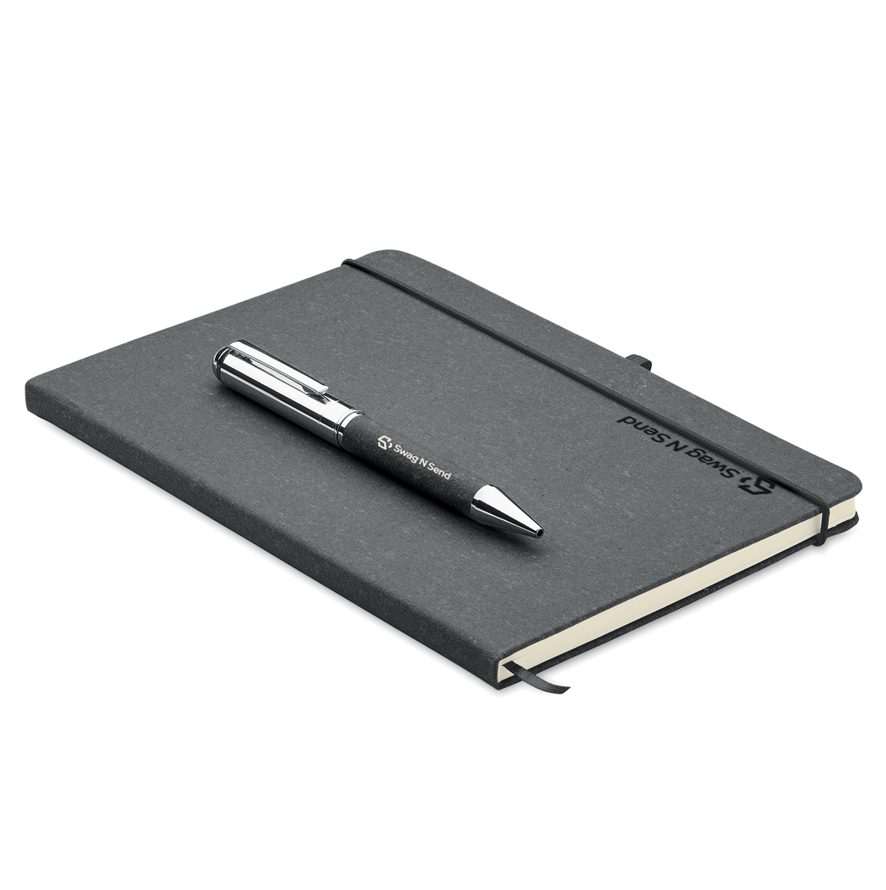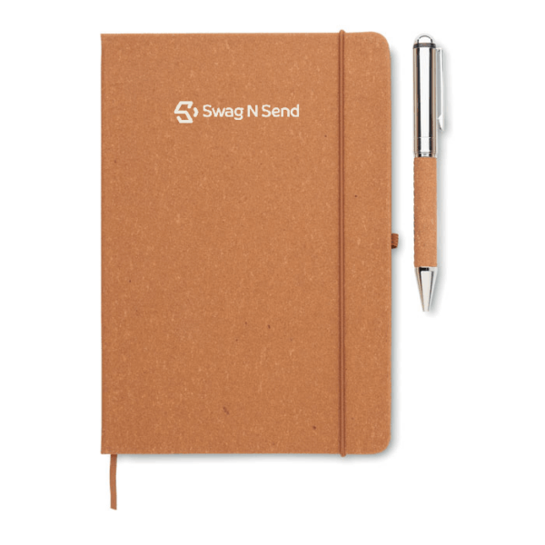 Gift set. Recycled leather (75%) A5 notebook with hard cover. Casebound. 160 lined pages made out of recycled paper (80 sheets). Matching elastic closure strap, ribbon page-marker and pen holder. Matching twist metal pen. Blue ink. Presented in a craft paper box. FSCยฎ-certified | FSC MIX CREDIT, P7.1, FSC-C213206