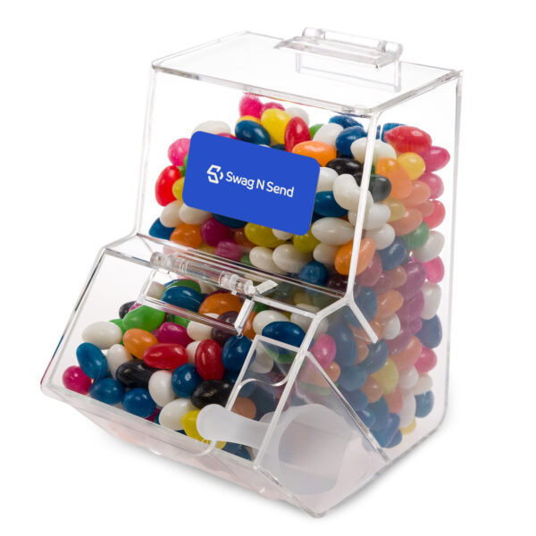 630 grams of assorted colour mini jelly beans packed in dispenser with scoop.